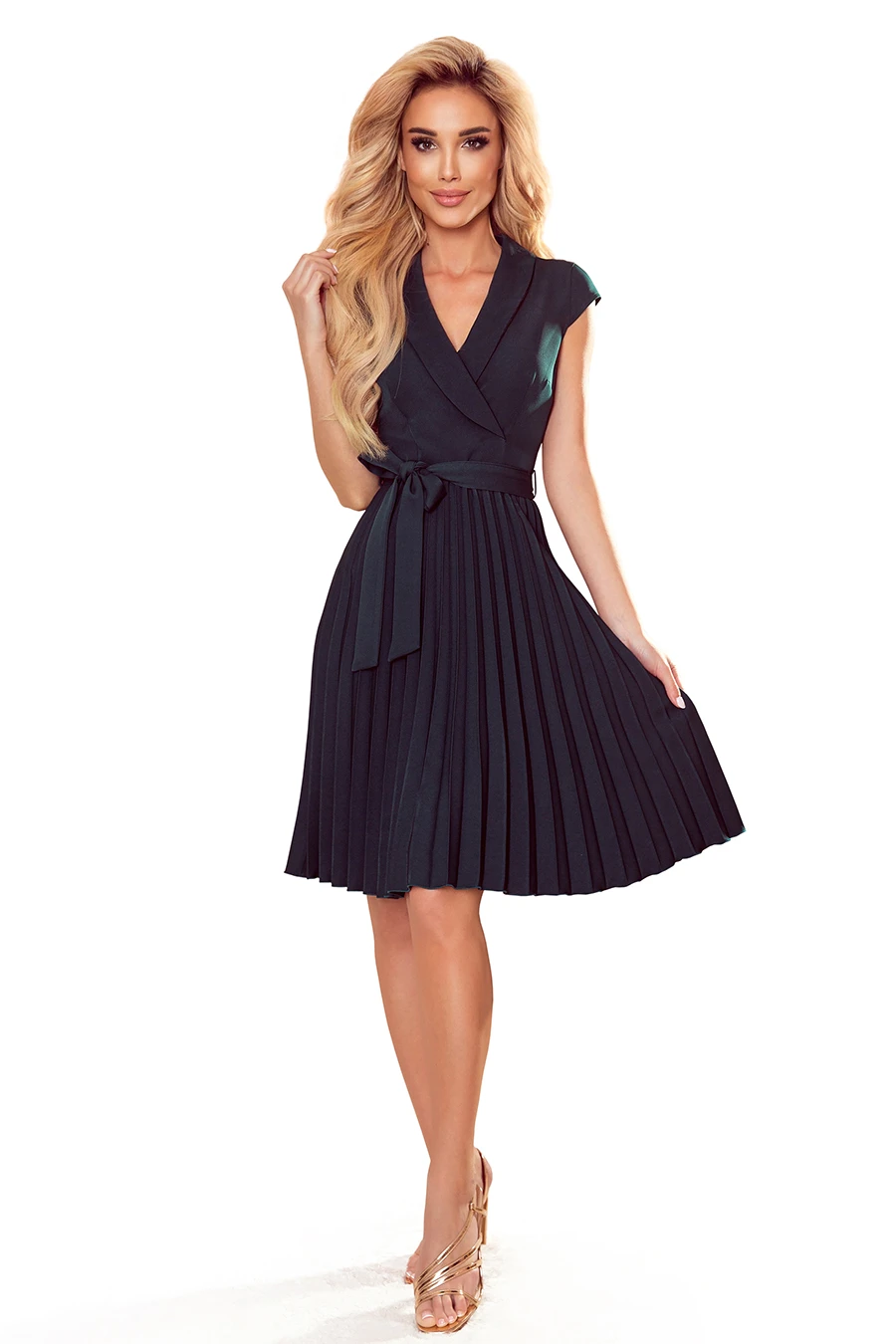 WENDY - pleated dress with an envelope neckline, short sleeves and a belt. Fastened at the back with a covered zipper. Color: green. Numoco brand. Polish production.