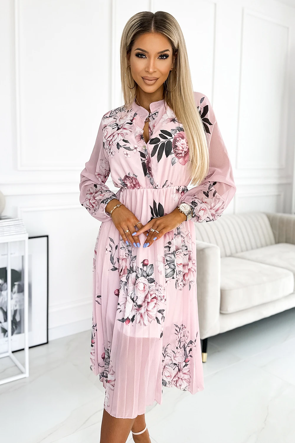 449-4 CARLA Plisowana sukienka midi z guziczkami i długim rękawkiem - RÓŻE na tle pastelowego różu