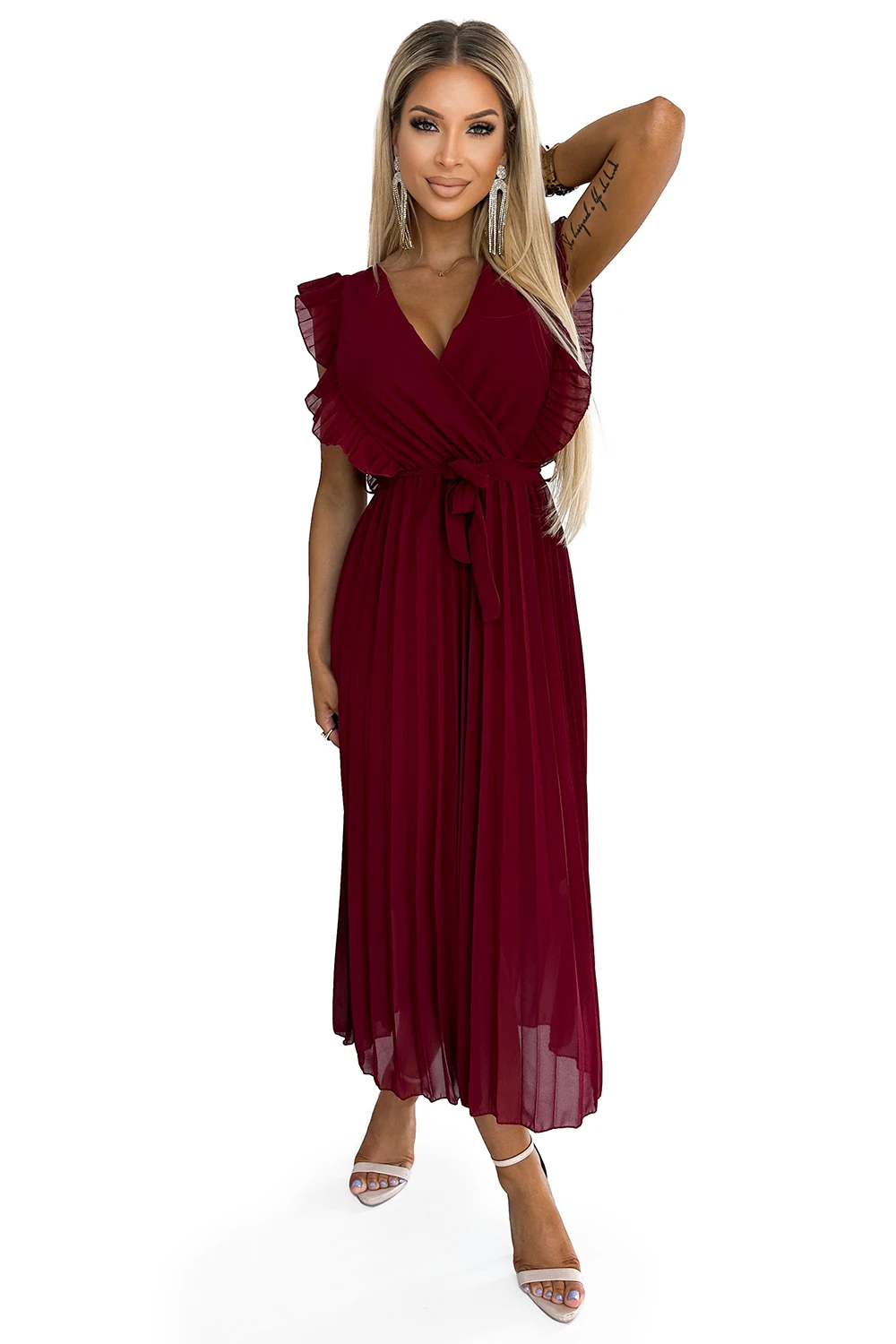 469-1 Pleated dress with frills, neckline and belt - burgundy