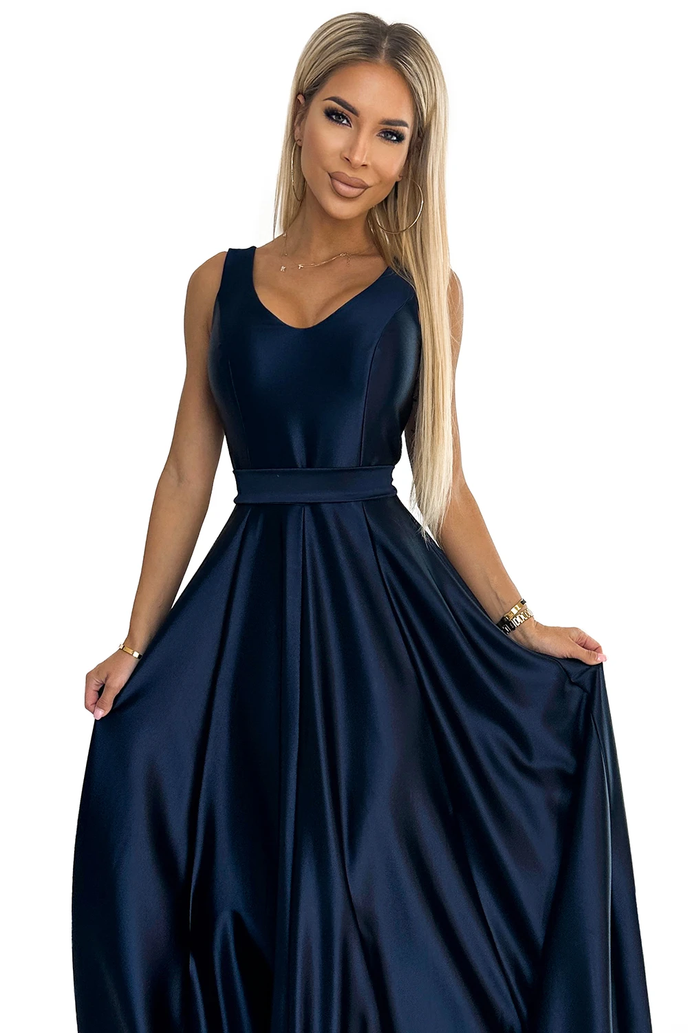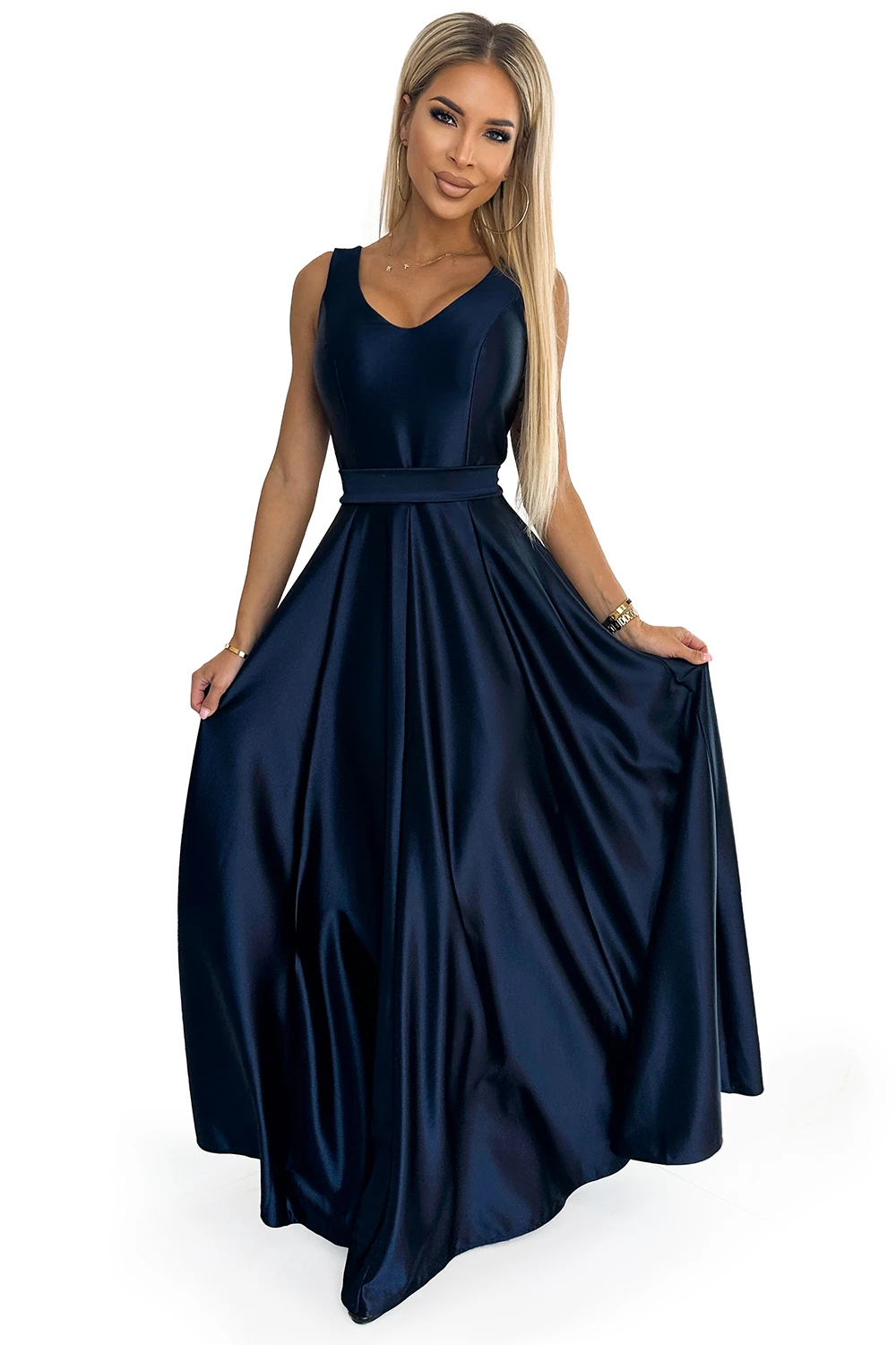 508-1 CINDY long satin dress with a neckline and bow - navy blue