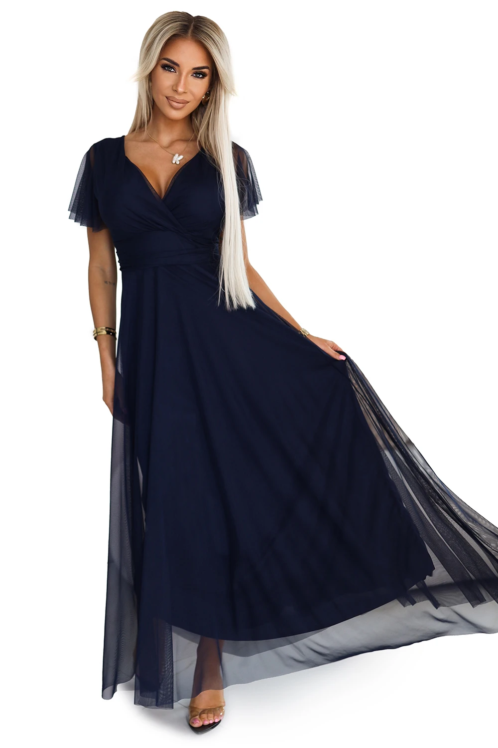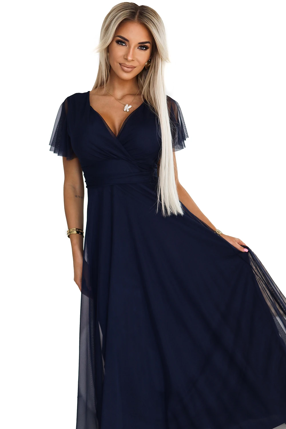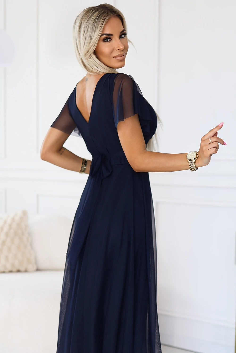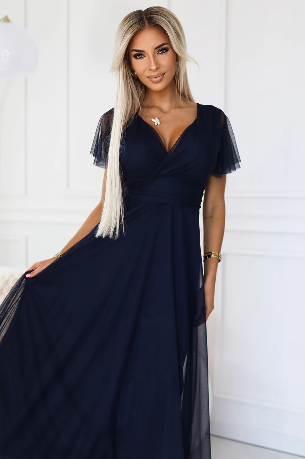 562-1 NASTIA Long dress with neckline and short sleeves - navy blue