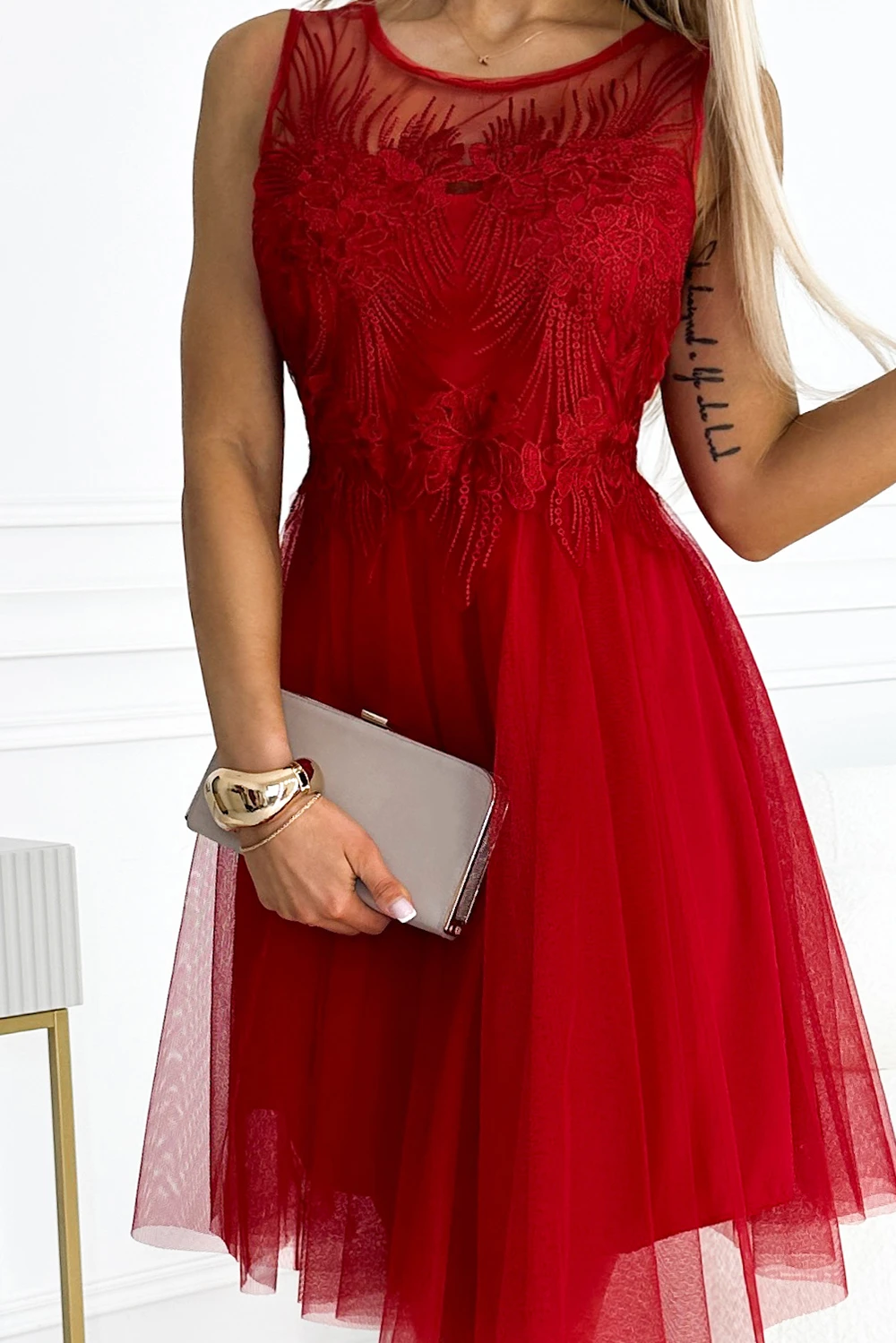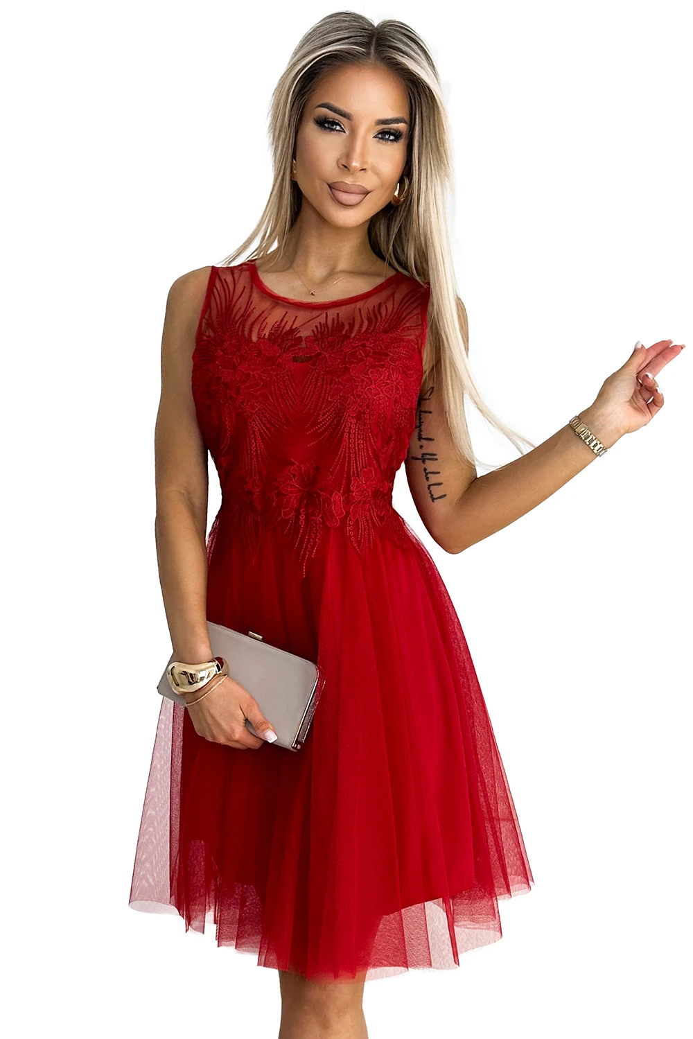 Caterina - feminine dress with guipure and delicate tulle. The back of the dress is made of elastic rubber, so it fits most sizes. Red colour. Numoco basic brand. European product. LIMITED EDITION