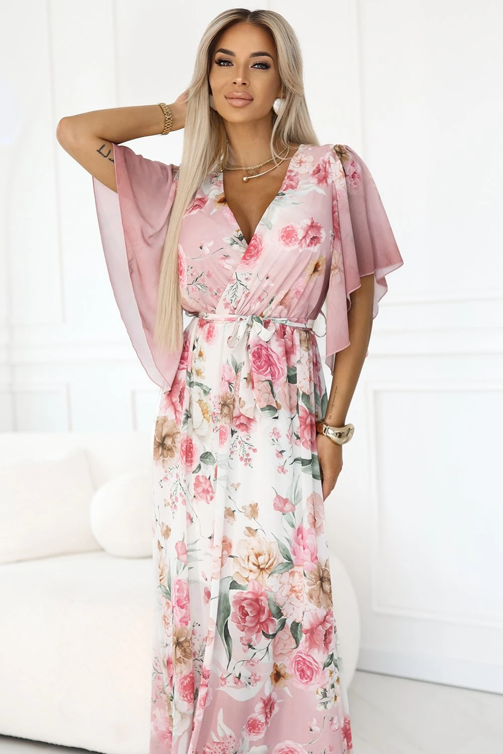 603-4 Airy wrap maxi dress with floral pattern – pink roses