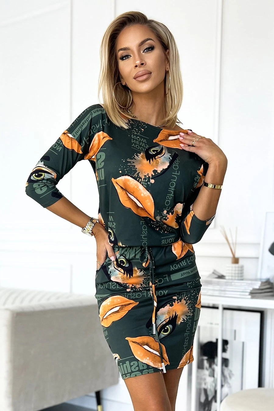 Original, eye-catching dress with trendy lips and eyes print is the perfect choice for women who love expressive style. Made from elastic, comfortable material, it perfectly fits the silhouette, while the 3/4 sleeve and waist tie add feminine character.