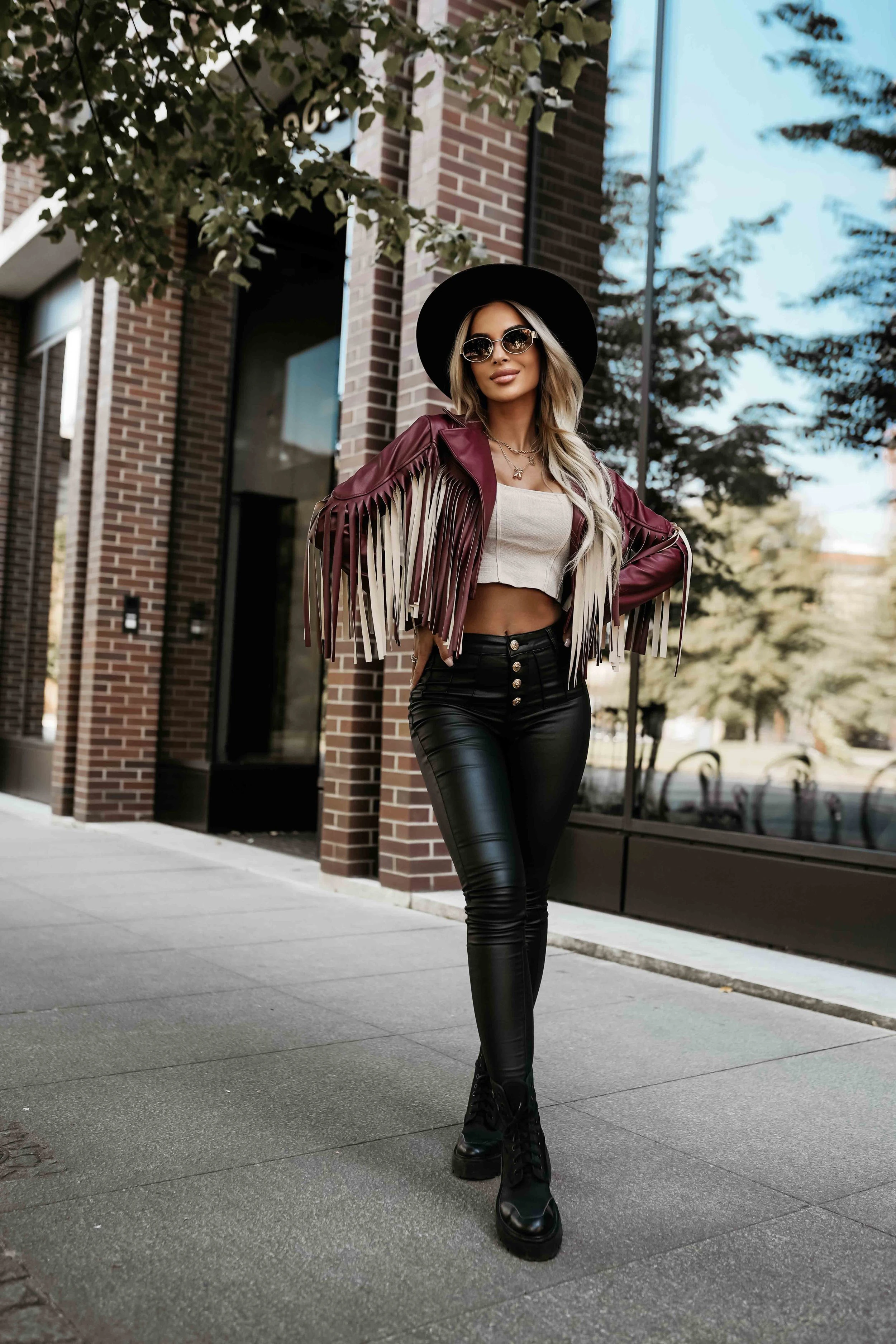 The original biker jacket with fringe is a proposal for women who like to stand out with style and emphasize their personality. Made from high-quality eco-leather in a deep burgundy shade, it enchants not only with its fashionable cut, but also with spectacular fringe in contrasting color, which gives it character in boho and rock chic style.