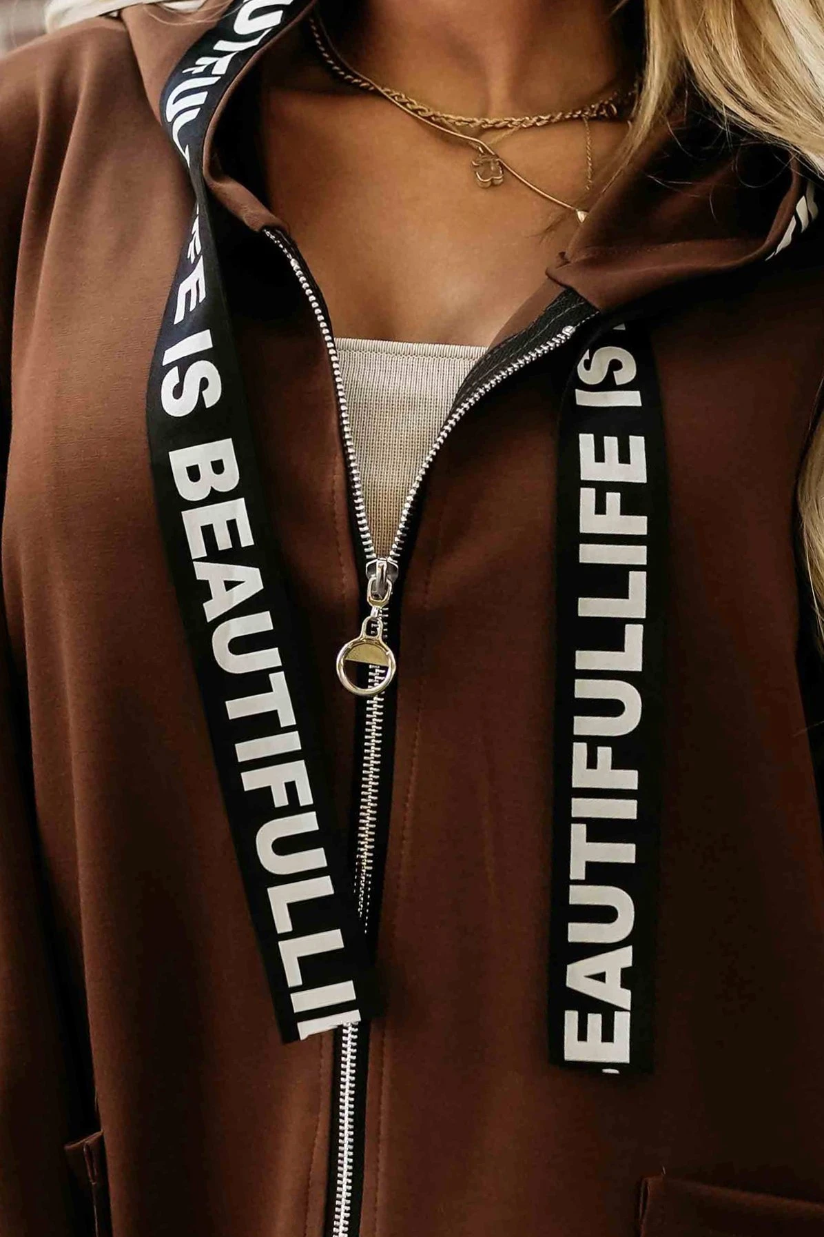 632-2 Casual coat with a zipper and fashionable details - chocolate