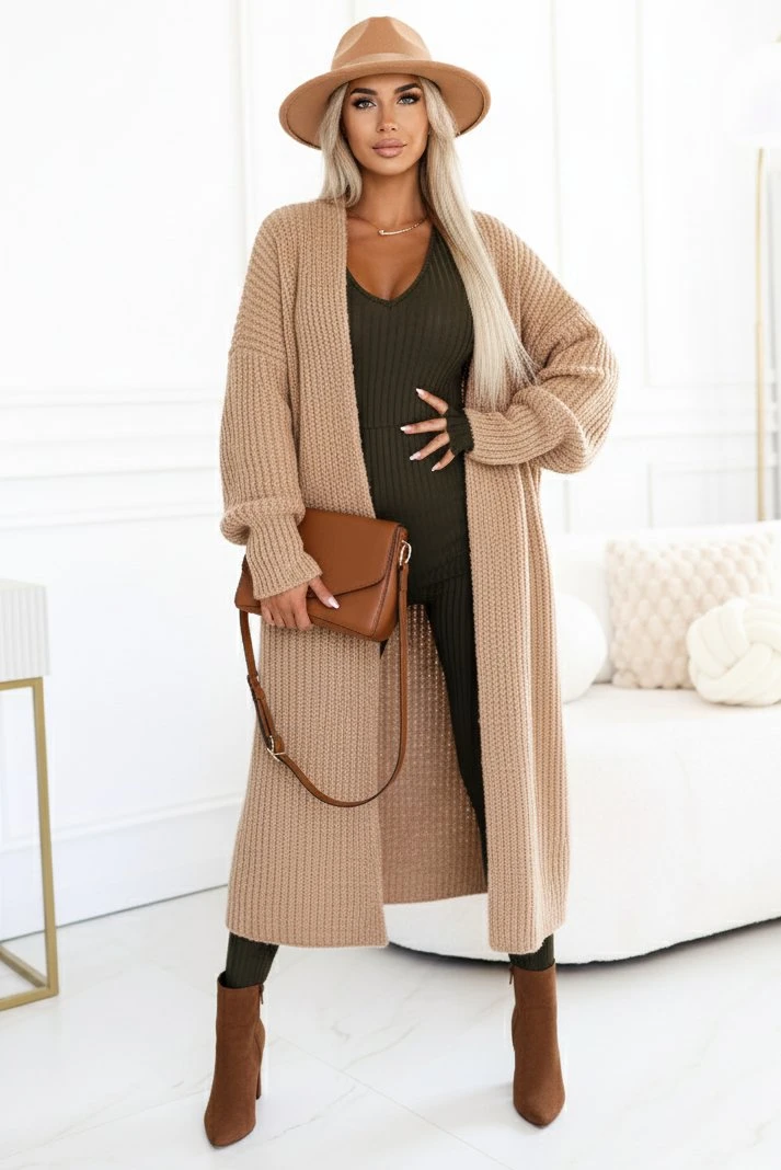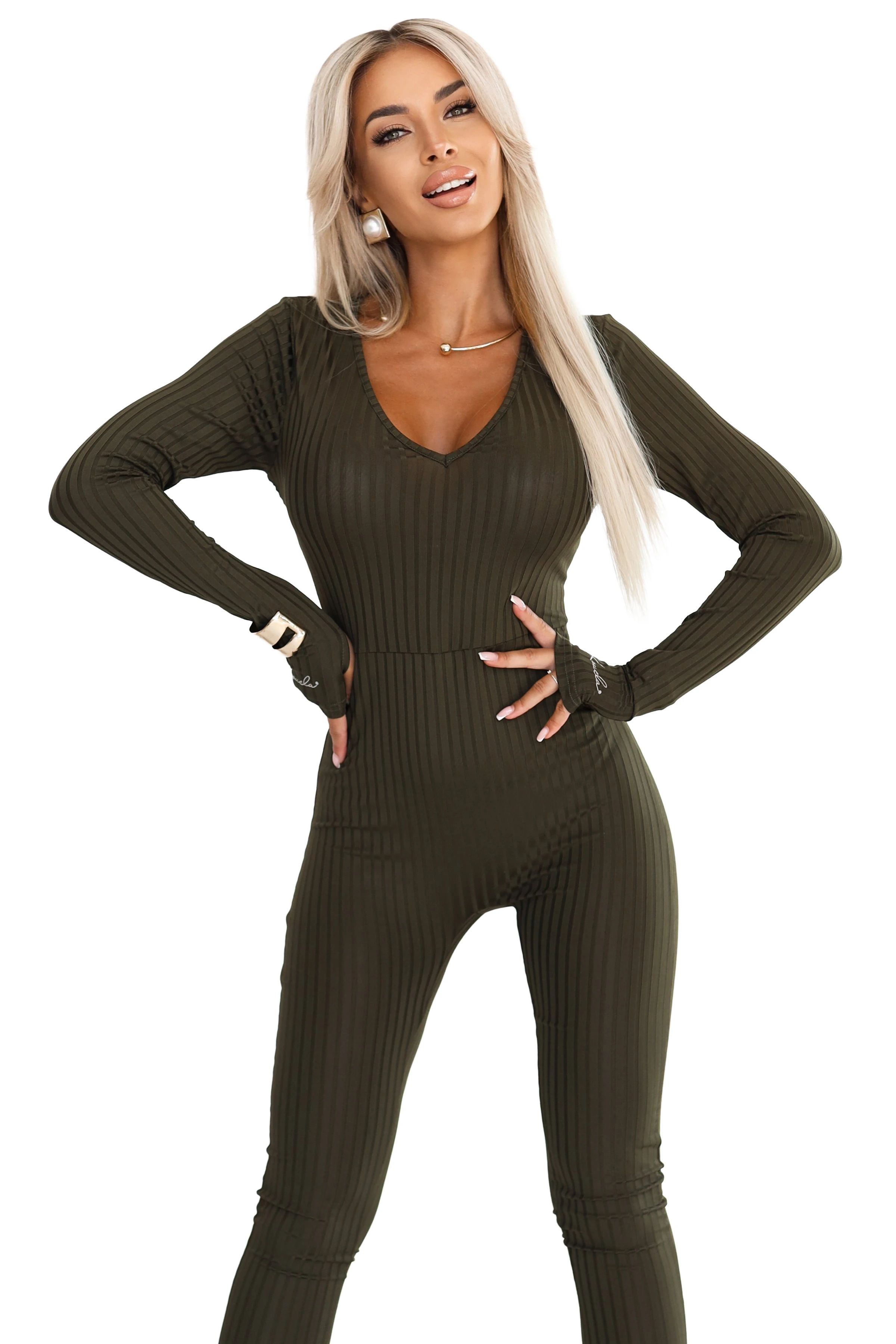 Stylish and comfortable ribbed jumpsuit in khaki color that accentuates the silhouette and ensures complete freedom of movement. The elastic knit beautifully hugs the body, while the V-neck and long sleeves add elegance for everyday wear and going out.