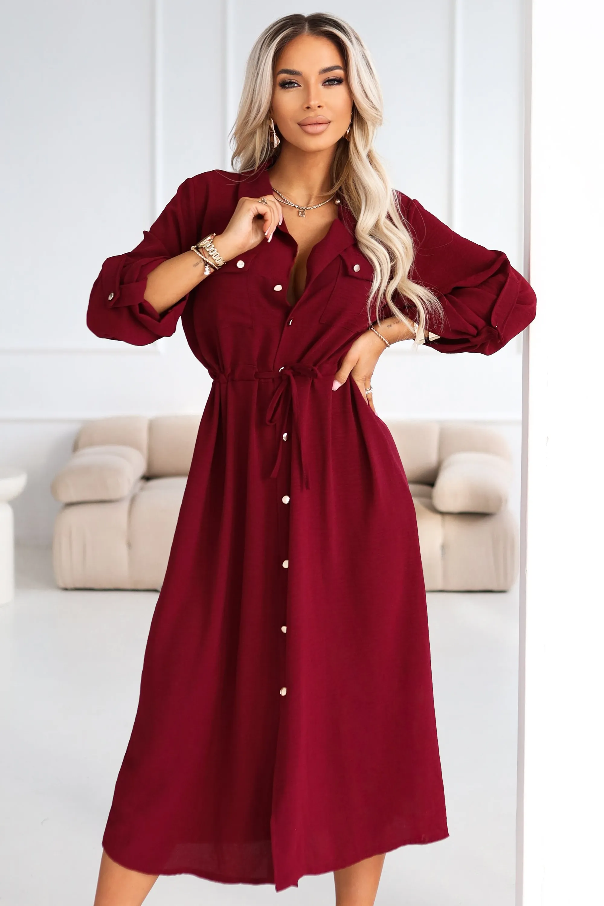 There's a moment when you walk into a room and silence speaks louder than compliments. It's not by chance - it's a well-tailored burgundy shirt dress working for your confidence. This shade emphasizes sensuality, and the midi cut gives exactly the amount of elegance you need - for work, for a meeting, and for an evening when the "just a moment" plan turns into "let's stay longer".