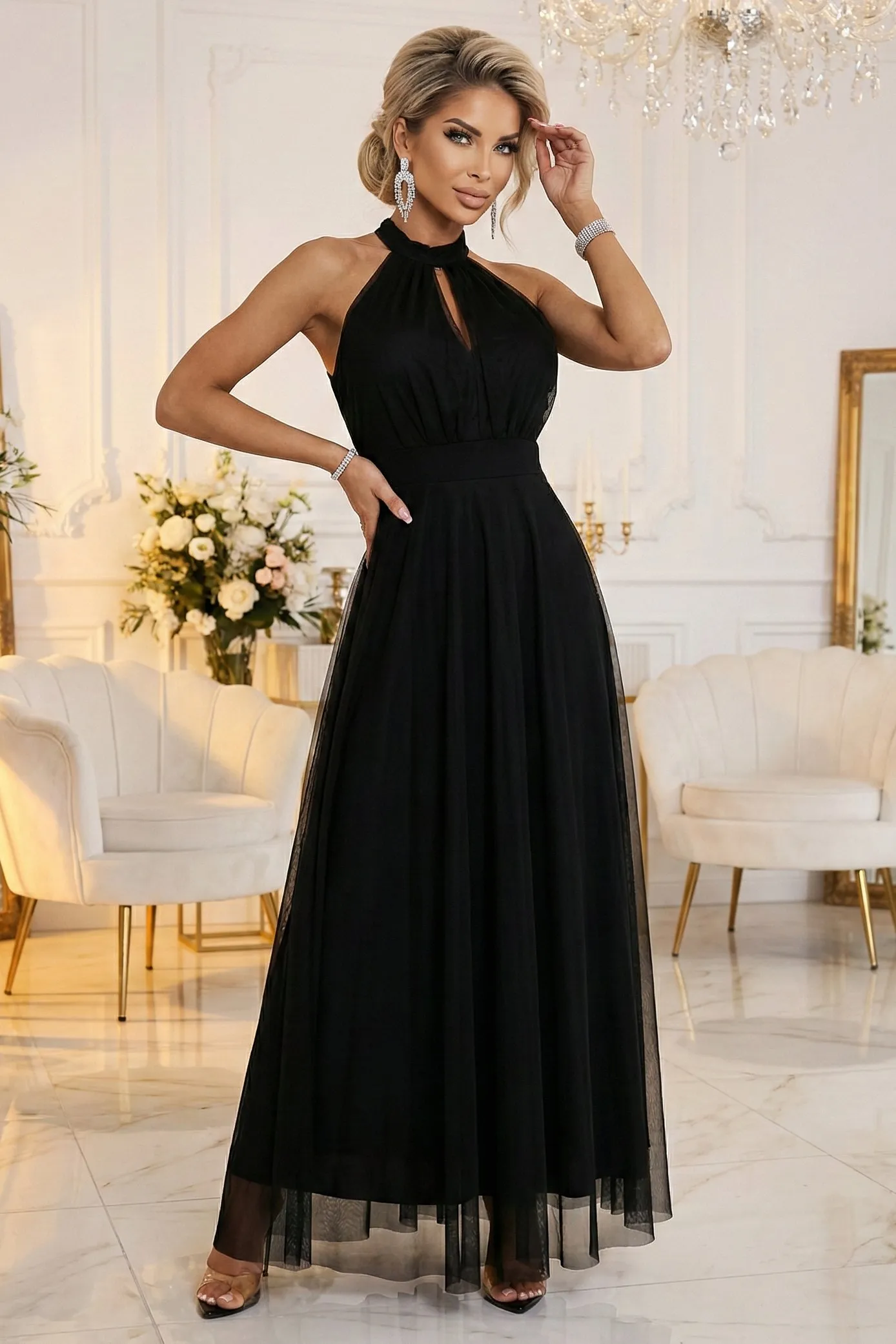 Czarna sukienka maxi Numoco Basic to elegancka sukienka wieczorowa z dekoltem halter i lekką, zwiewną tiulową spódnicą. Wiązanie w talii pomaga dopasować fason, a produkcja europejska podkreśla jakość wykonania. Idealna na wesele, na studniówkę i wieczorne przyjęcia.