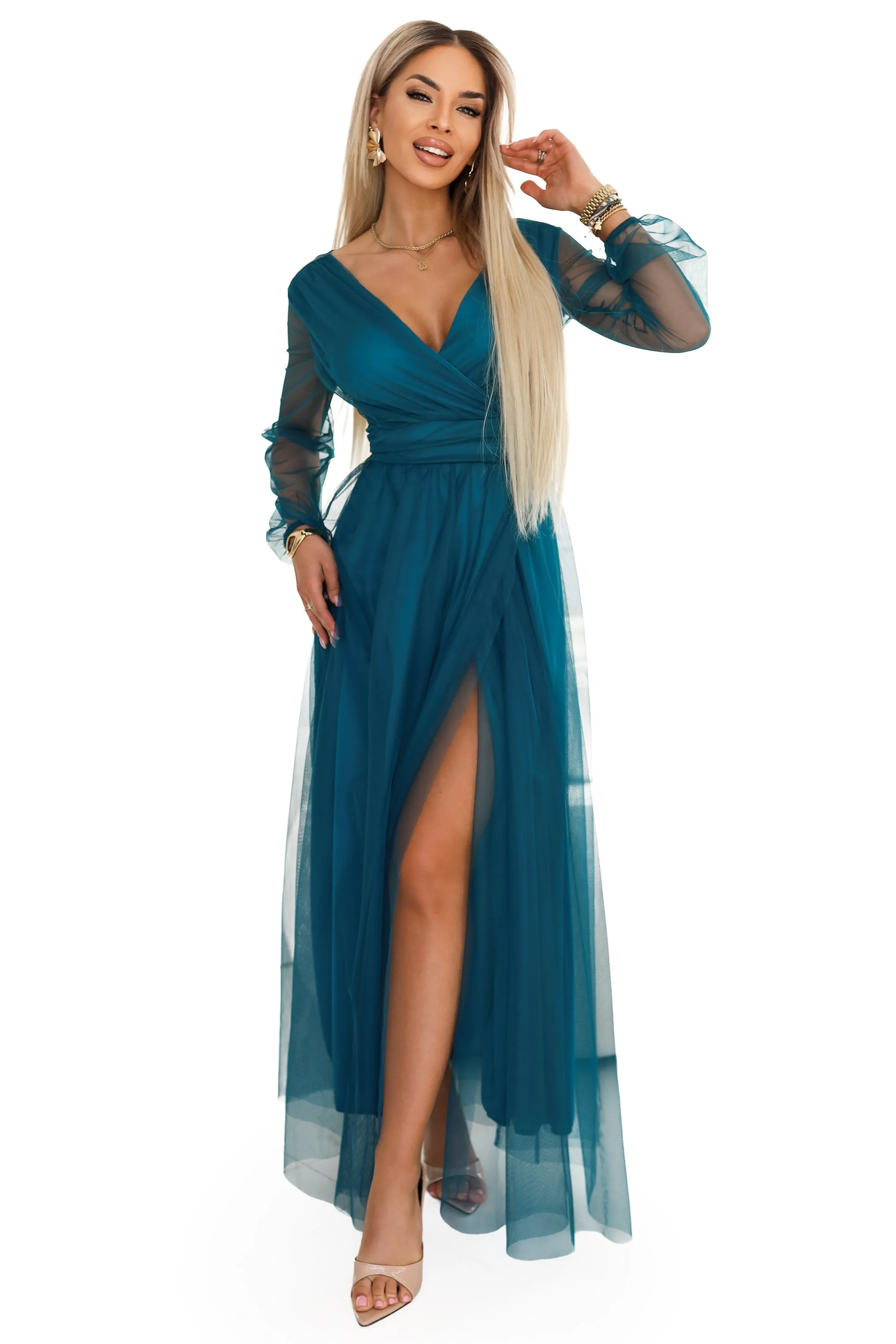 Some occasions call for looking stunning while still feeling completely at ease. This bottle green dress does exactly that: the soft tulle moves beautifully with every step, the wrap neckline subtly accentuates the bust, and the slit adds confidence with each stride.