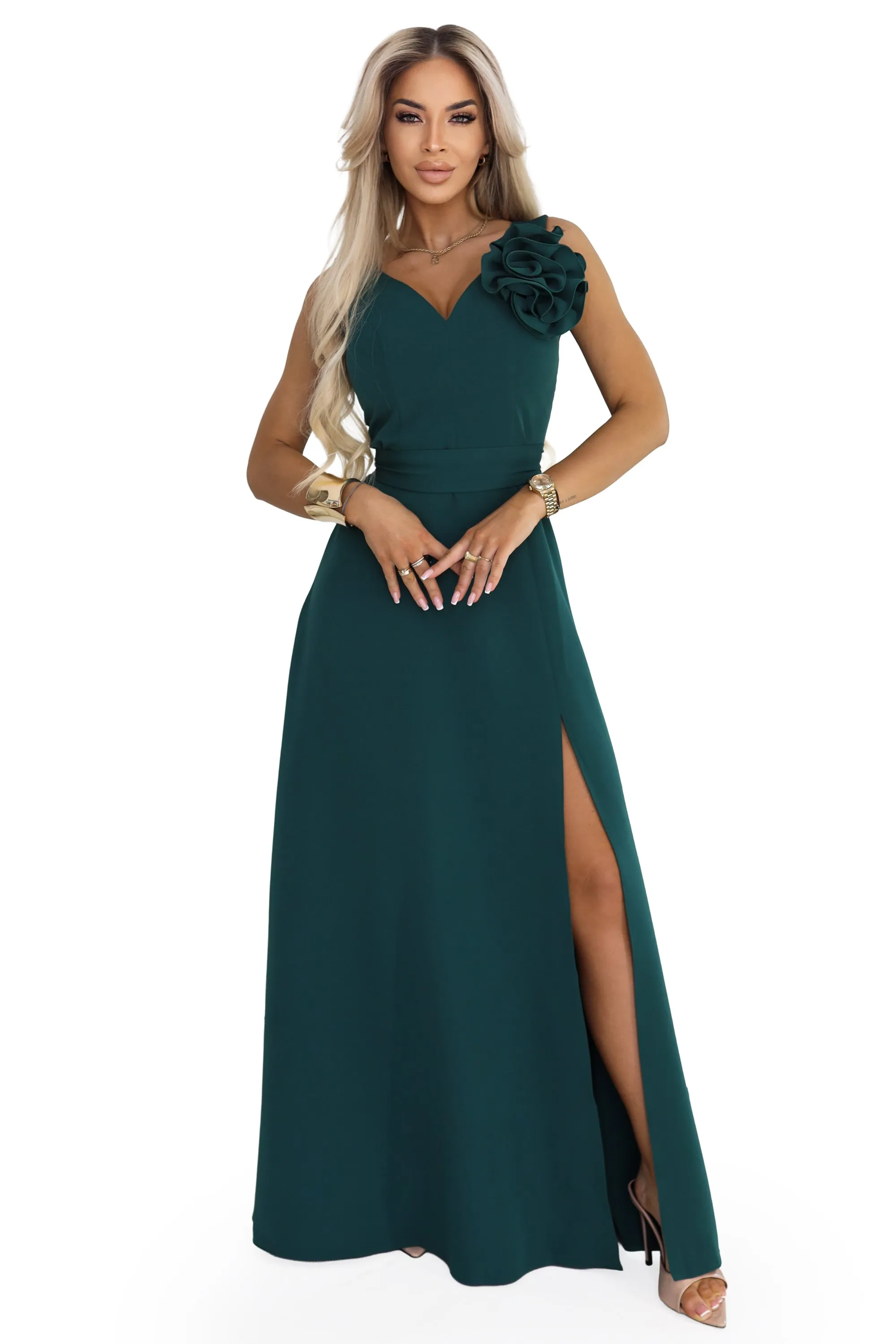 669-1 Romantic maxi dress with a flower on the shoulder and a slit - bottle green