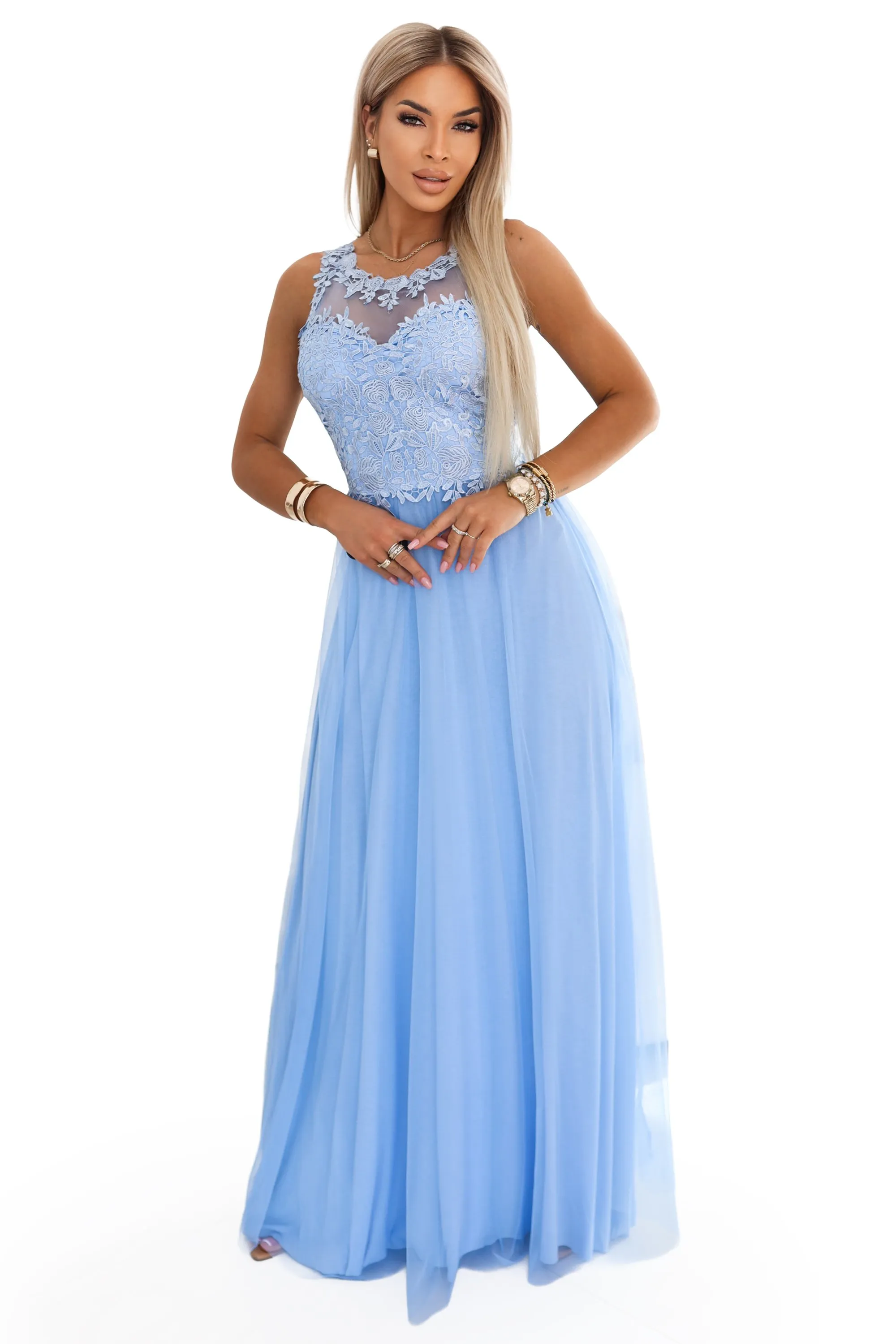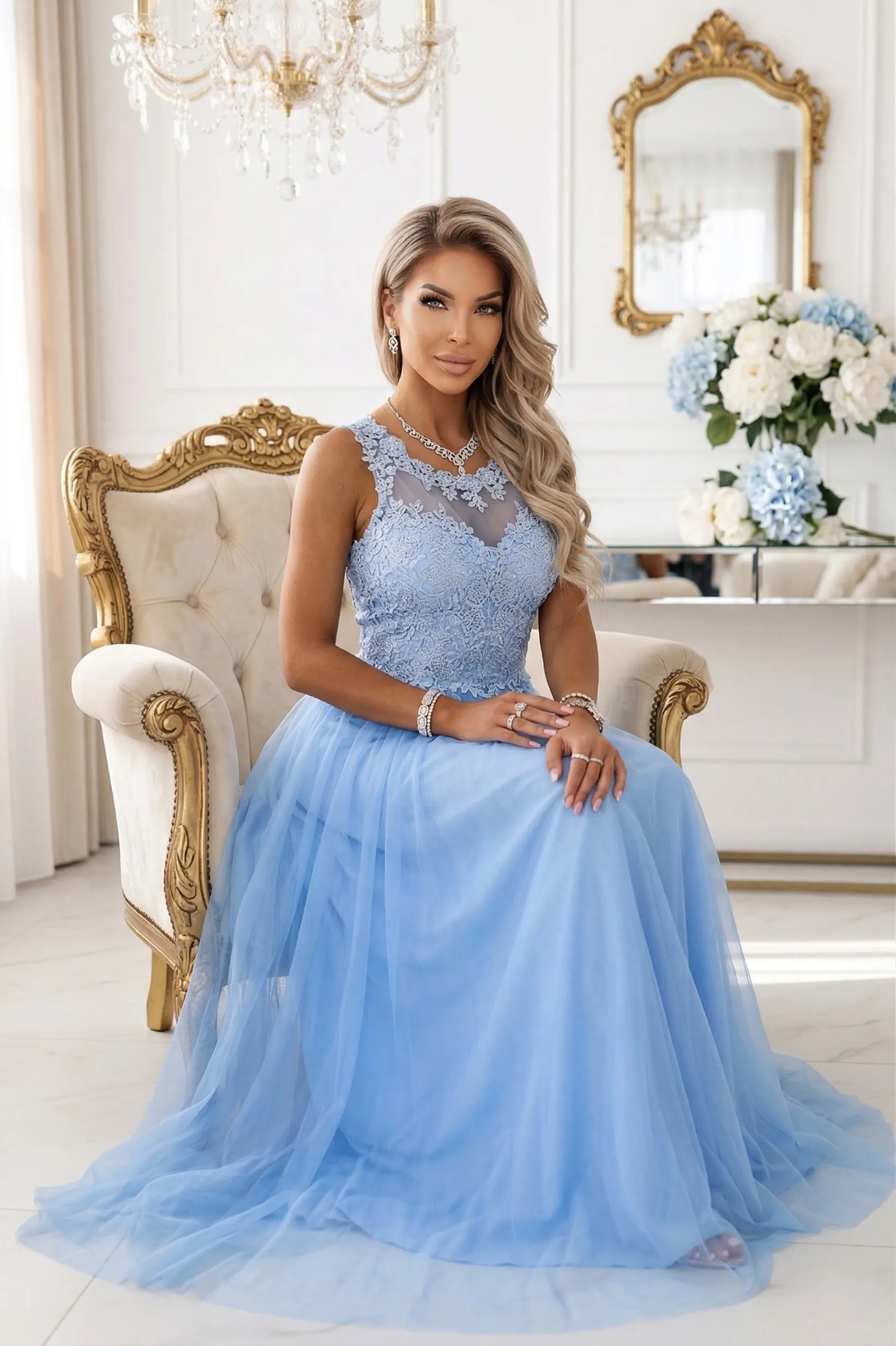 This long maxi dress in light sky blue is a great choice for a celebration when you want a romantic effect and an elegant look. The tulle skirt drapes softly when walking, while the lace bodice stands out with its careful finishing. This is an evening dress that you can easily match to the style of any party, pairing it with heels or delicate sandals and jewellery.